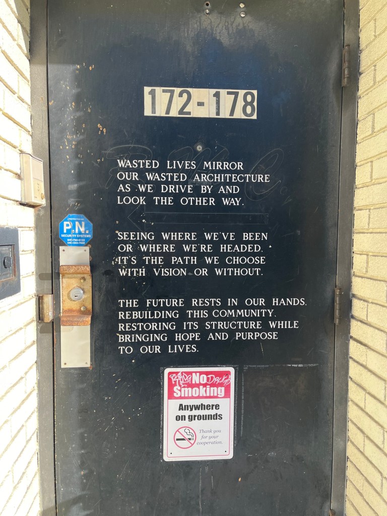 The Recovery Management Corporation, an addiction recovery service had a really apt saying on their door, which we can all take to heart. “The future rests in our hands, rebuilding this community, restoring its structure while bringing hope and purpose to our lives.”
