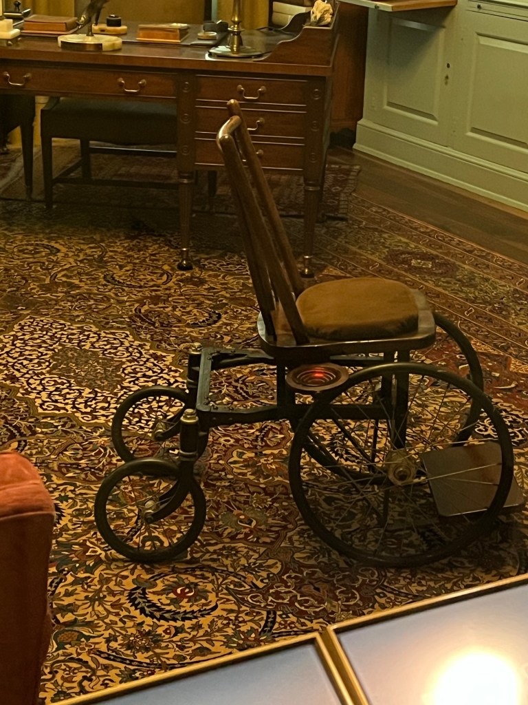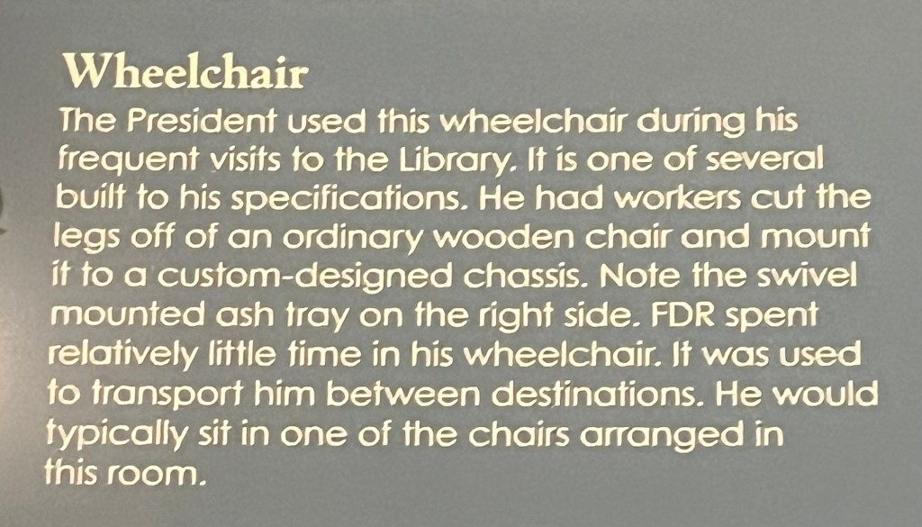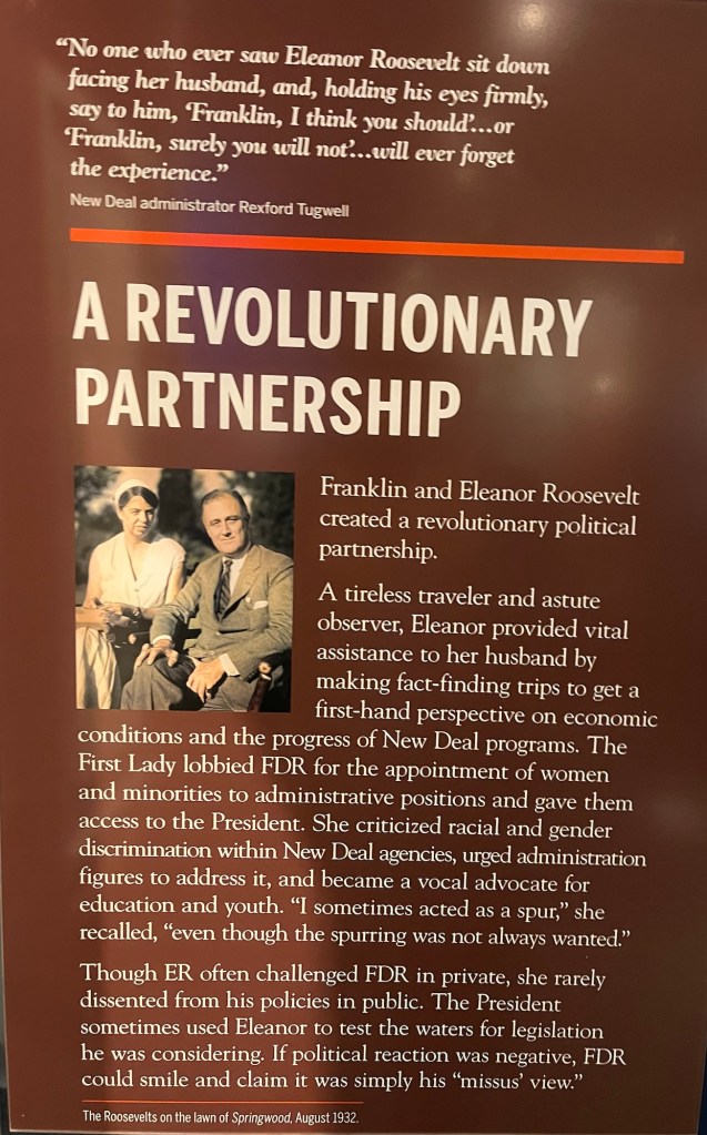 “Eleanor dreaded becoming First Lady. A writer, teacher, social reformer, political activist, she relished her hard-won freedom and financial independence. Though happy for her husband’s success, she now faced the prospect of a life confined to the traditional social duties of the ‘President’s Wife’. At FDR’s insistence, Eleanor resigned all her professional positions. She came to Washington with no defined role other than White House hostess. Yet ER soon began showing FDR how her energy and interest could help him achieve his goals. Instead of conforming to the accepted role of First Lady, she redefined it. She began holding press conferences on political matters for female reporters. She made fact finding trips- logging 40,000 miles in three months. She asked Americans to write to her with their concerns. Within months she received 300,000 letters. ER’s actions served notice that she was a new kind of First Lady.” From museum display