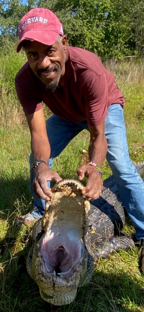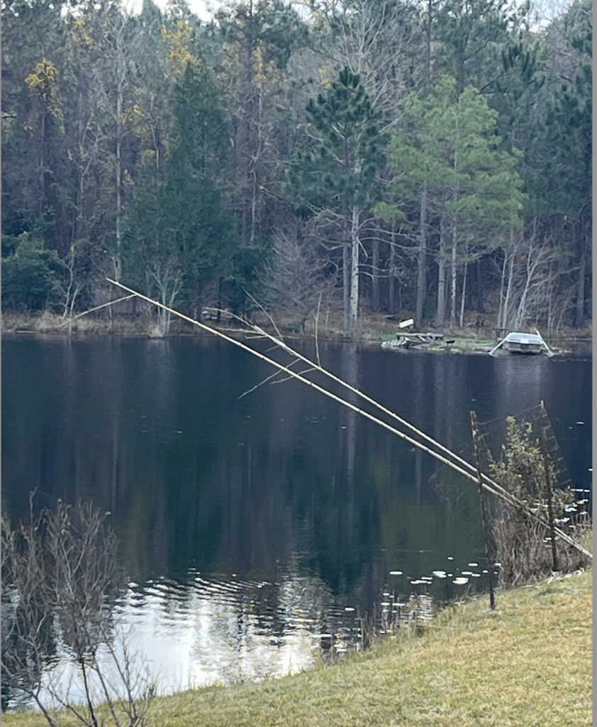 The Thompsons have a lake right outside their back door and yes, there are alligators in that lake! We learned how to catch an alligator: you get a long pole, secure it to the bank and tie a rope on the end to hang just above the water with a big hook on it. Tie a chicken on the end of the rope. Wait. Before long. the alligator will jump out of the water, swallow the chicken and the hook will get caught in its stomach. If it does not die right away, you can shoot it i n the head. You should call the state wild life control people to come out and do this!