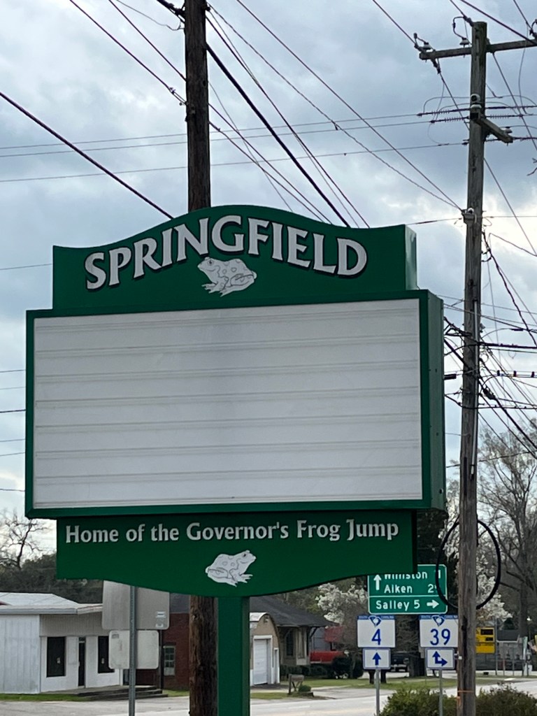 Springfield, SC, population 455, is a sleepy town as evidenced by the sign on the main street and their on-line calendar, which is blank. However, the Governor’s Frog Jumping competition has been happening here on Easter weekend for 50 years!