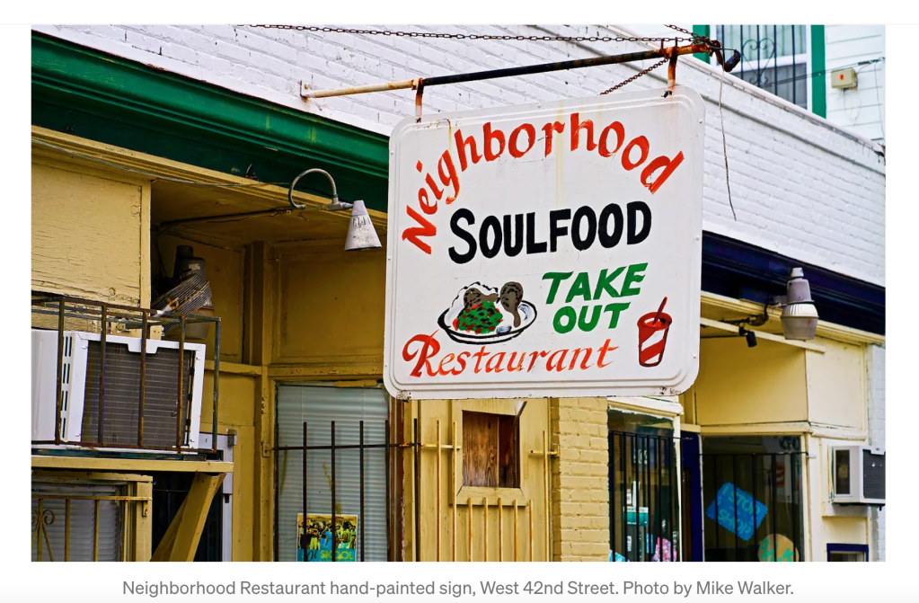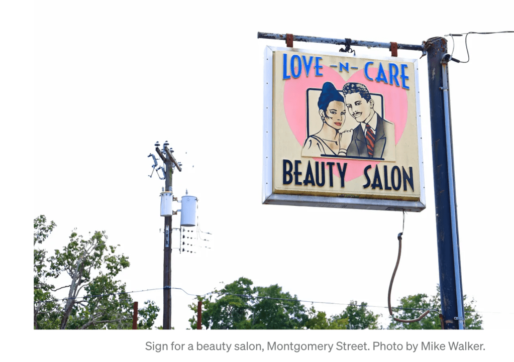 Many businesses in Cuyler-Brownesville had hand-painted commercial signage, a creative tradition in the South especially prevalent in African-American neighborhoods. Lettering on such signs is calligraphic or in the style of hand-lettering used by graphic designers for poster and print work prior to the advent of digital desktop publishing, The signs are large, colorful and often includes drawings related to the business at hand—such as scissors and a blow-dryer for a beauty parlor or crabs and lobsters for a seafood shop. (Williams, et al; 204–205)