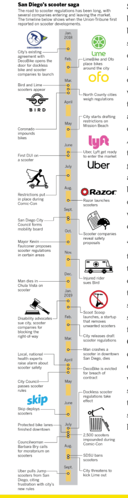 Since San Diego was one of the first cities to embrace e-scooters; cities looking to adopt e-scooters (like our hometown Ithaca, NY) would do well to pay attention to what happens here. How many companies are optimal? What regulations are needed to encourage companies to self regulate but not drive them out of town? Stay tuned!