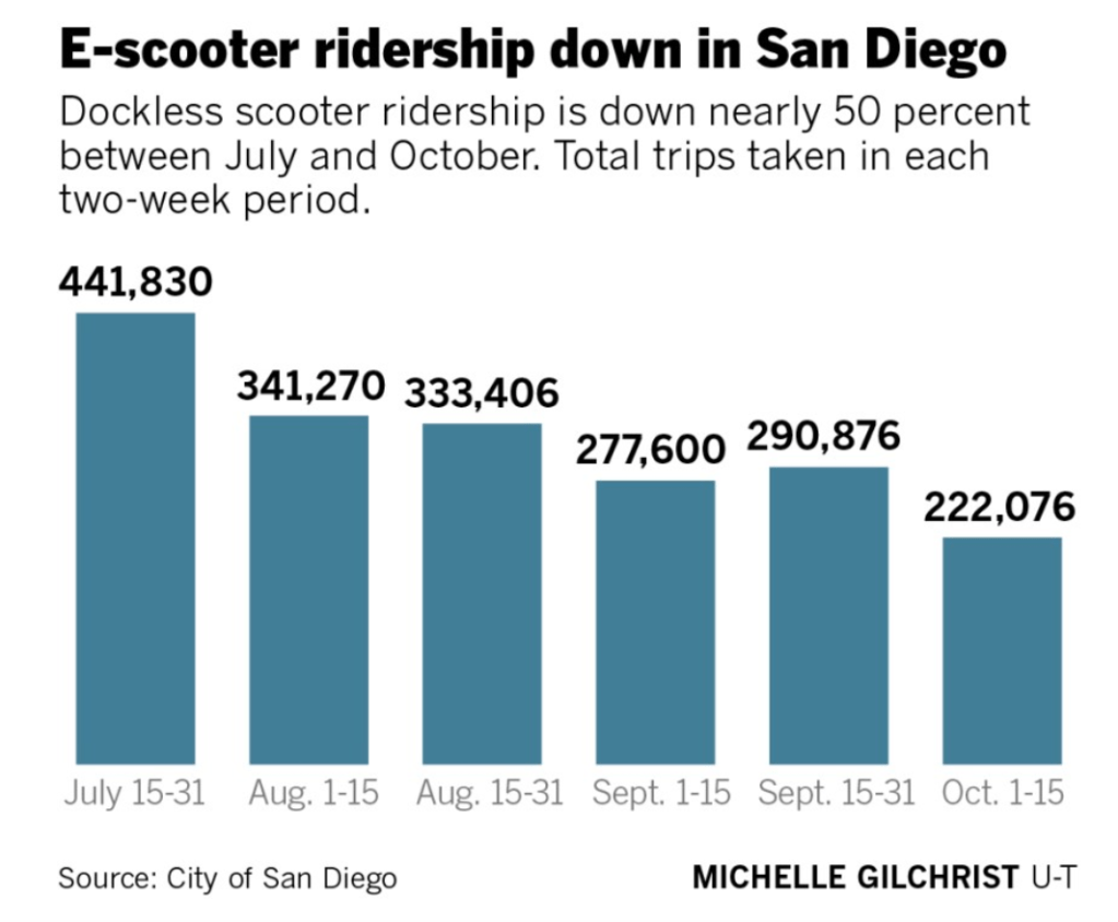 As a result of what they view as too much regulation, declining ridership, and the need to cut costs, Lime, the first dockless e-scooter company to set up shop here is now leaving . And Uber’s Jump and San Francisco-based Skip have already left. Last year, seven companies rented e-scooters- Lime, Jump, Bird, Lyft, Skip, Spin and Wheels- now four are left in San Diego. Lime is also leaving Austin, Atlanta and Phoenix.
