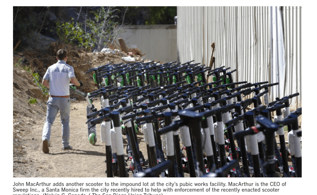 The law most hated by the companies is the impoundment policy. In order to unclog sidewalks, the city has painted over 500 “corrals” on streets around the city. E-scooters must be parked in the corrals. A company is notified and has three hours to remove stray e-scooters or or they are subject to impoundment. The city of San Diego has collected a quarter-million dollars in fees as a result of impounding more than 3,700 vehicles.