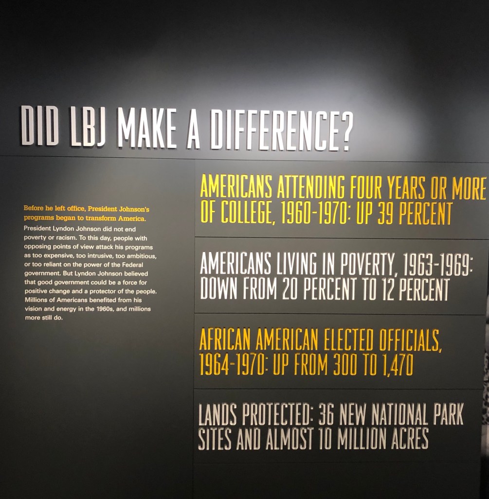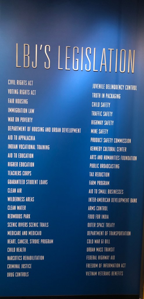 This afternoon we went to to the Lyndon B Johnson Library and Museum on the UT campus. The Vietnam War really tarnished LBJ’s reputation and he is not remembered fondly. Today we were reminded of how much legislation he got passed that really made a difference in the lives of Americans including: civil rights act, voters rights act, medicaid and medicare, fair housing act, and immigration reform.