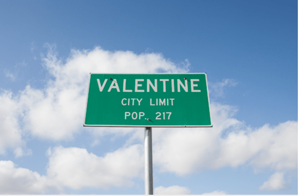 Valentine was founded in 1882, when a railroad crew had finished laying the tracks to the point where a water and fuel depot would be needed. It was Valentine’s Day, so the story goes, and they named the depot Valentine. The president of Wells Fargo and a major stockholder in the railroad was named John Valentine, which is the less romantic and probably real reason for the name. Valentine is halfway between L.A. and New Orleans, almost exactly 1000 miles each way. . In 1900 Valentine had two saloons, a butcher shop and a general store. Area ranchers shipped cattle out of Valentine but by the 1950s with the increase of trucks being used to haul cattle, Valentine’s railroad depot was closed down. At that point Valentine was no longer a thriving railroad community and the majority of the businesses closed down.