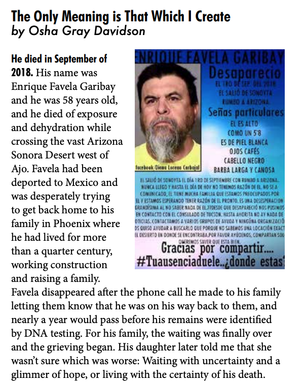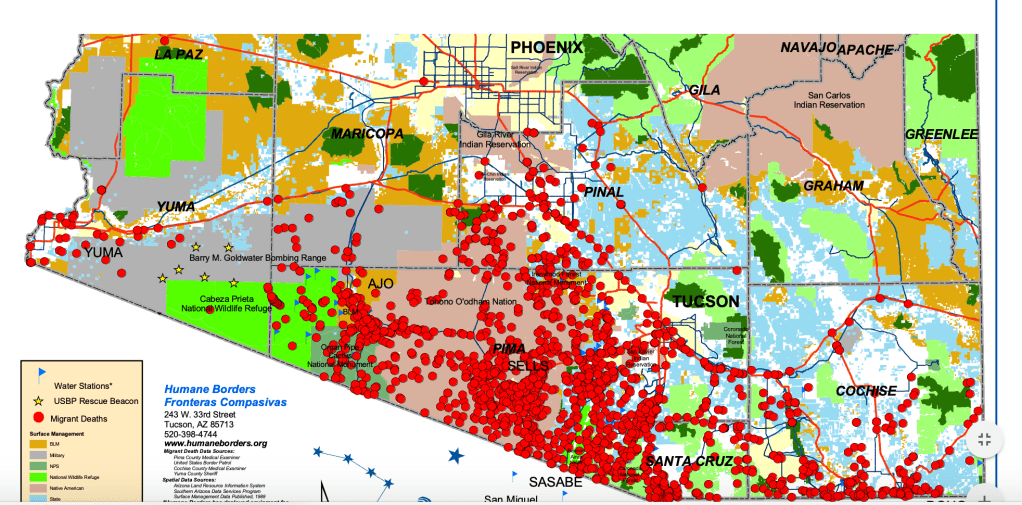 The above excerpt was written by a volunteer with Humane Borders, a volunteer organization founded in 2000, that maintains a system of water stations in the Sonoran Desert on routes used by migrants making the perilous journey here on foot. Their primary mission “is to save desperate people from a horrible death by dehydration and exposure and to create a just and humane environment in the borderlands. We locate our water stations on government and privately owned land with permission from the landowners.” Over 3000 people have died crossing the Arizona desert since January 1999 (Humane Borders website).