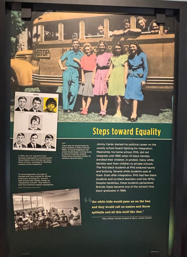 Jimmy graduated from this school in 1941. It was called the high school but served white students from grade 1-11. There was no 12th grade. In 1941 schools were racially segregated. I believe Sumter County has always been a majority Black county, so the majority of children had to attend far inferior schools. Jimmy Carter served on the Sumter County School Board after Brown vs the Board of Education supreme court case that desegregated schools. He had to tackle the question of school consolidation and desegregation. It took him a while to decide to attack desegregation head-on. Once he did, it gave him valuable lessons that made him a much better Governor and President. Here is an interesting “ Study of Segregation, Politics, and Public Education in Sumter County, Georgia, 1930s-1970s” if you would like more information.