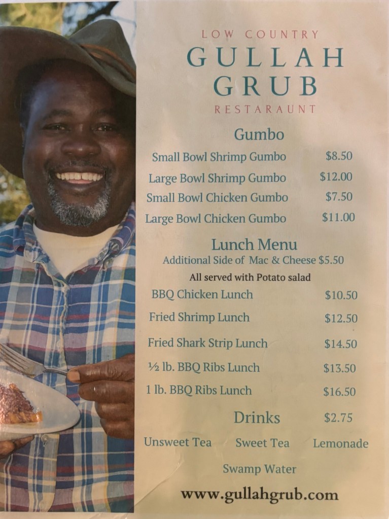 What to do on a rainy day? We decided it was a good day to check out the local cuisine. We are on St. Helena Island near Beaufort, SC. having lunch at the Gullah Grub Restaurant.. The Gullah Grub restaurant serves real Low Country meals that follow the Gullah traditions of eating fresh, local and in season. Owner and Chef Bill Green will cook you up some delectable local dishes.