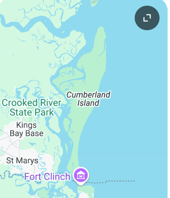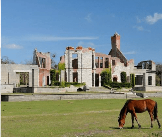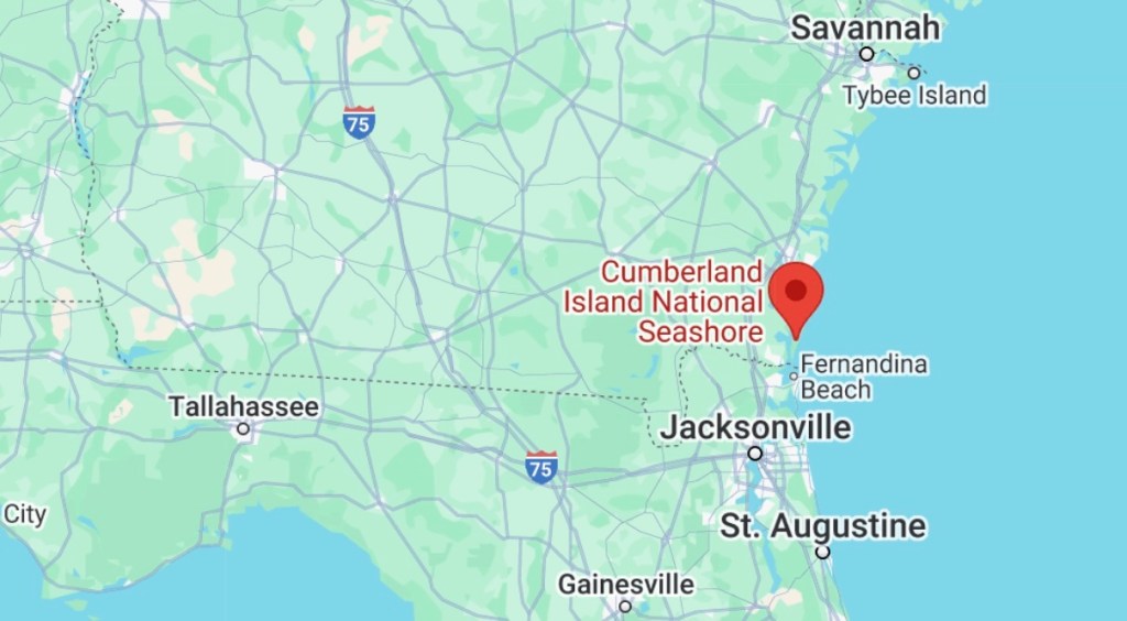 Cumberland Island is near the Georgia/Florida border, just 54 miles north of Jacksonville, Florida. It is Georgia’s largest barrier island.Cumberland Island has has beaches, dunes, marshes, maritime forests, freshwater lakes, feral horses and ruins of historic mansions originally built by the Carnegie family in the 1880s.