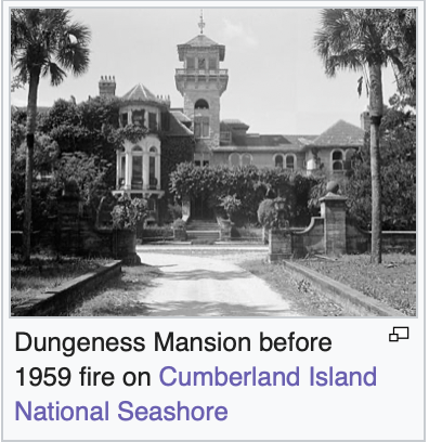 After the civil war ended, many wealthy northern industrialist families were drawn to the south. They appreciated the warm weather and real estate was dirt cheap. In the 1880s Thomas M. Carnegie, brother of steel magnate Andrew Carnegie, and his wife Lucy bought land on Cumberland for a winter retreat. In 1884, they began building a mansion, called Dungeness, though Carnegie never lived to see its completion. Lucy and their nine children continued to live on the island. The Carnegies built other mansions for the heirs and owned 90 percent of the island. During the Great Depression, the family left the island and left the mansion vacant. It burned in a 1959 fire, believed to have been started by a poacher who had been shot in the leg by a caretaker weeks before. Today, the ruins of the mansion remain on the southern end of the island.