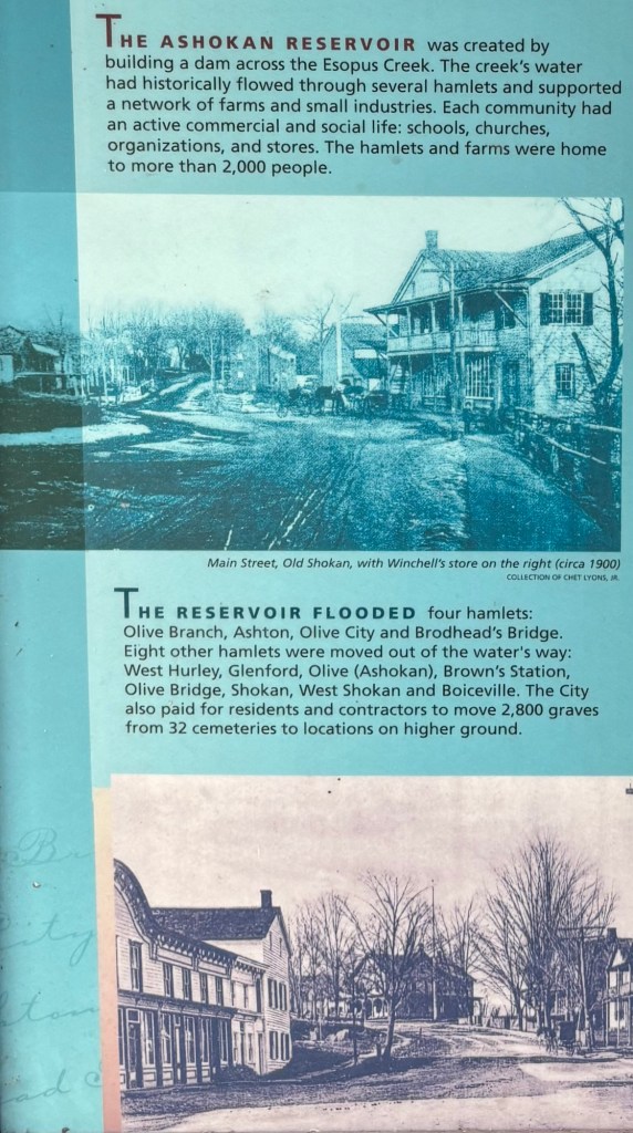 We stopped to take a walk on the Ashokan Reservoir Promenade, a walking and bicycle trail around the edge of this mammoth 8,300 acre reservoir that supplies 40 percent of New York City drinking water. This project finished in 1915 was an engineering marvel at the time. It consists of 5.5 miles of dams and dykes within the Esopus Creek drainage in the Catskill Mountains. The water travels under the Hudson river via the 92 mile Catskill Aqueduct to New York City by gravity alone. The water is so clean that it does not require filtration and only minimal treatment is needed.