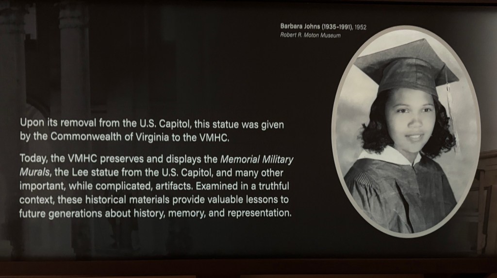 On Wednesday we visited the Virginia Museum of History and Culture (VMHC) in Richmond. I I had very mixed feelings when I saw the VMHC had a Lost Cause room. However, I do think it is important not to forget history lest we repeat it. I believe it was truthfully done, the murals, statue and other artifacts on display with plaques telling the truth and dispelling myths.