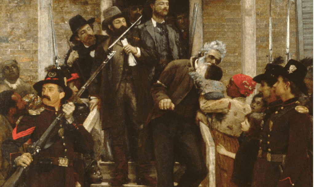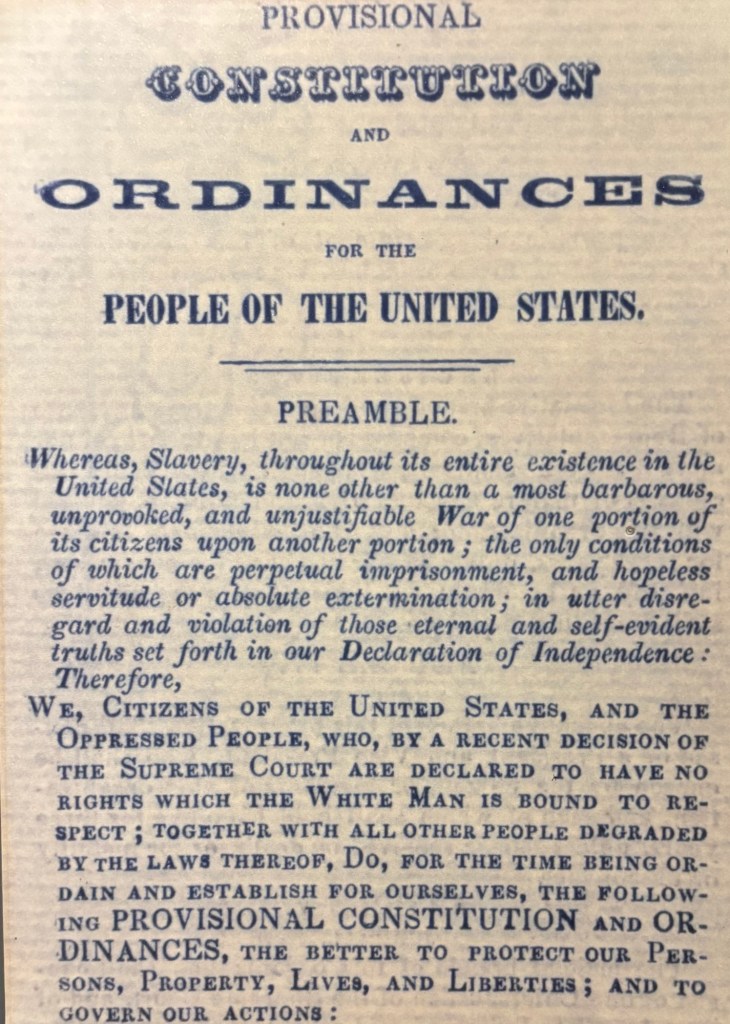 Thomas Hovenden, The Last Moments of John Brown (detail), 1182, oil on canvas, 196.5 x 168.3 cm. Courtesy The Metropolitan Museum of Art.At an anti-slavery convention in Chatham, Ontario, John Brown presented a new constitution abolishing slavery.