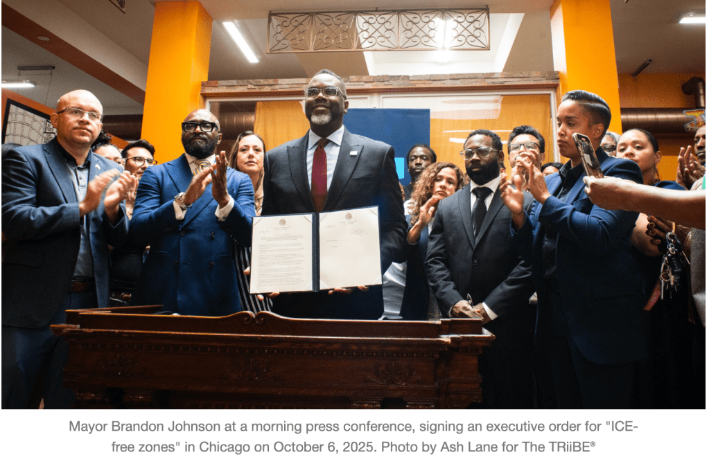 Chicago Mayor Brandon Johnson has signed an executive order declaring public property, such as parks and city garages, off limits for ICE agents. They may not use public property for staging any more. He has encouraged private businesses to join with them.