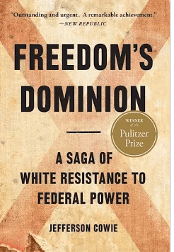 It is here in Barbour County, Alabama that Jefferson Cowie, in his Pulitzer Prize winning book, Freedom’s Dominion: A Saga of White Resistance to Federal Power (2022) chronicles “the unholy union , more than two hundred years strong, between racism and rabid loathing of government” (New York Times Book Review). I have always associated “freedom” with the fight of the oppressed for a better, more just world. Freedom is also a word used by those looking to dominate. This book helped me understand the hatred of white supremacists toward the Federal government that Trump used to enflame his followers to act during the January 6th, 2021 insurrection. I was first alerted to this book because Cowie is scheduled to speak at Ithaca College on Thursday, March 28th, at 5pm in the Park School Auditorium.