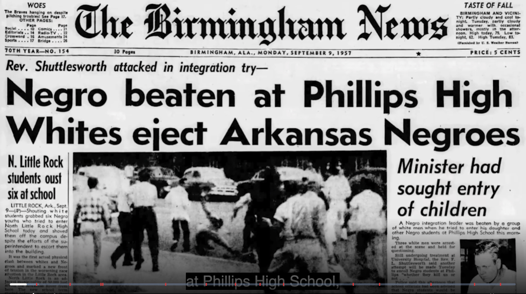 After the Brown vs.the Board of Education Supreme Court ruling desegregating schools, Birmingham schools stayed segregated. Shuttlesworth tried to enroll his own children at a white high school in Birmingham. The Klan was waiting for him in front of the school and beat him so bad he ended up in the hospital.